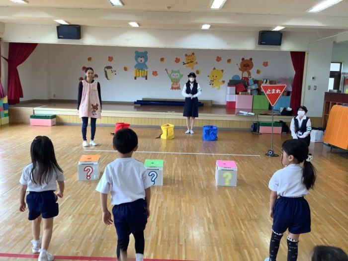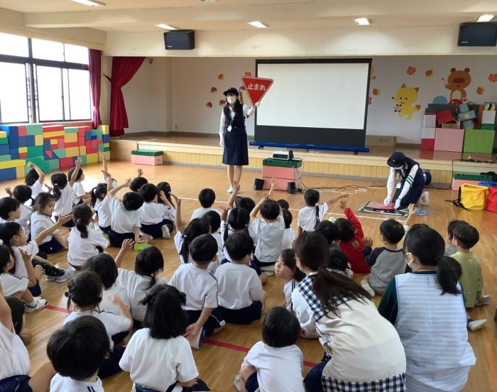 横断歩道の歩き方を指導員方と一緒にしたり、4歳児、5歳児の大きいクラスの子どもたちは、「止まれ」の標識でしっかり止まるという交通ルールをゲームを通して学んだりすることができました。