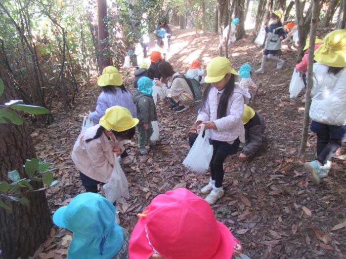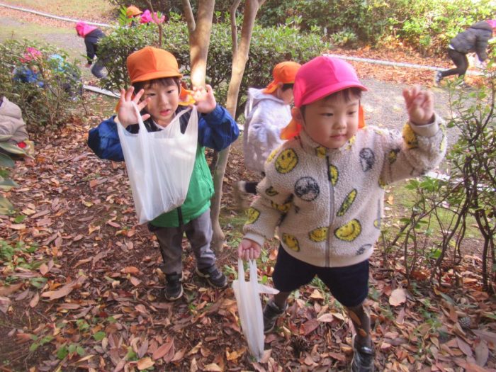 秋晴れの中、西大畑公園にみんなでどんぐり拾いに行きました。「あった!」「こっちにも!」と、子どもたちはどんぐり、松ぼっくりを夢中になって見つけて歓声をあげてて夢中になって拾っていました。